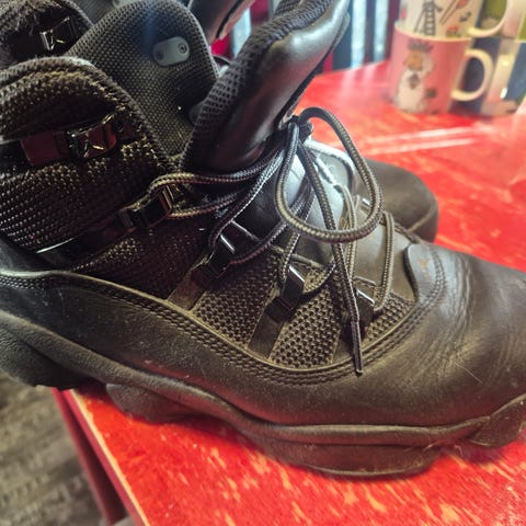 Jordan tennarit, koko EU 43 (US 9.5). Väri musta/punainen. Korkeavartinen malli nauhakiinnityksellä. Kokolapussa nimi, varressa vähän kulumaa.