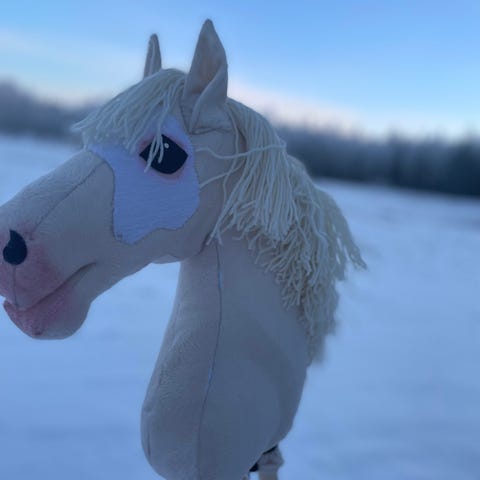IKEA keppihevonen, vaaleanruskea pehmeä hevosenpää ja vaalea harja. Puinen keppi helpottaa lelun käsittelyä ja ratsuleikkejä. Soveltuu lasten leikkeihin sisällä ja ulkona valmistajan ohjeiden mukaan.