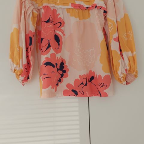 Marimekko pusero, naisten koko M. Väljä, suorahko malli, jossa pyöreä pääntie ja poimutusta etu- ja takakappaleella. Pitkät, hieman pussimaiset hihat kuminauharypytyksellä hihojen suissa. Materiaali on puuvillaa (puuvillapopliinia). Kuosissa on suuria, monivärisiä kukka- ja kasviaiheisia kuvioita vaalealla pohjalla. Soveltuu arkikäyttöön ja vapaa-aikaan. Tämä on se kuuuluisa ”Sharon Stone”-paita.