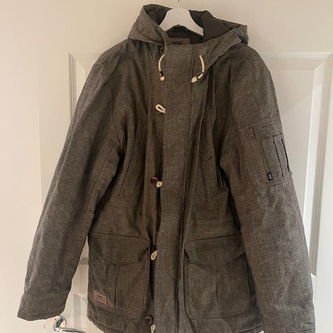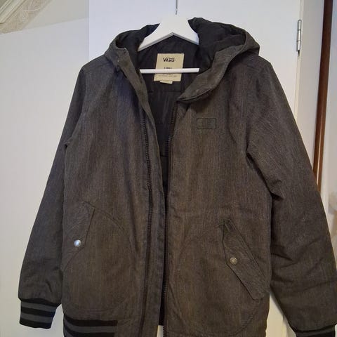 Vans miesten talvitakki koossa S, menee myös koossa M. Harmaa, meleeratun näköinen kangas. Takissa on kiinteä huppu, vetoketju- ja nappikiinnitys sekä etutaskut. Lämmin ja soveltuu hyvin kylmään säähän. Hyvä käytetty kunto. Nouto Espoonlahti tai toridiili.