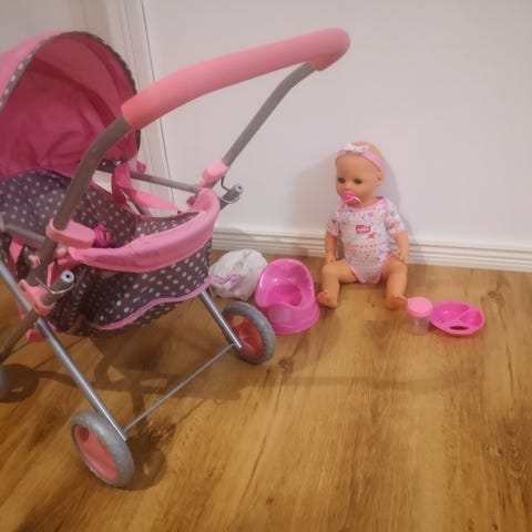 Baby Born nukkevauva, jolla on siniset vauvanvaatteet ja myssy. Mukana tulee potta, tuttipullo sekä tutti ja tutinpidike. Voin postittaa, postikulu ostajalle.