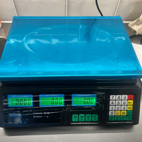 Vaaka on käytetty, mutta täysin toimiva. Pinnassa näkyy normaalia käytön jälkeä (näkyy kuvissa), mutta ei vaikuta käyttöön.