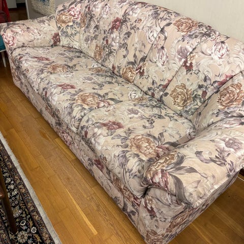 Vanha mutta asiansa ajava sohva. Istuintyynyt vähän kulahtanut. Yksi jalka irti, mutta pysyy paikallaan.