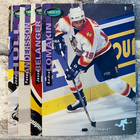 1994 Parkhurst jääkiekkoilijakortit, joukkueena Pittsburgh Penguins. Setissä 5 kappaletta pelaajakortteja, etupuolella pelaajakuva ja takapuolella tilastotietoja ja lyhyt kuvaus pelaajasta. Kortit sopivat kokoelmiin tai vaihdettaviksi muiden jääkiekkokorttien keräilijöiden kanssa.