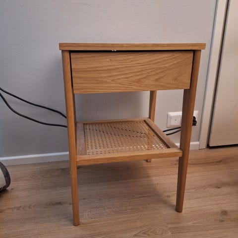 Myydään valkoinen Jyskin yöpöytä laatikolla ja hyllyllä. Puunväriset jalat. Hyvässä kunnossa, ei juuri käytön jälkiä.