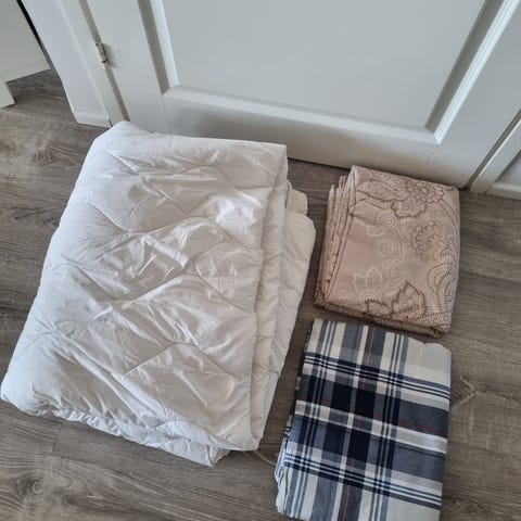 Materiaali on puuvillasatiini. Settiin kuuluu iso pussilakana 240 x 200 ja parivuoteen aluslakana ja 4 tyynyliinaa. Lakanat ovat ehjät ja puhtaat. Taloudessani ei oke eläimiä. Voin postittaa kuluja vastaan.