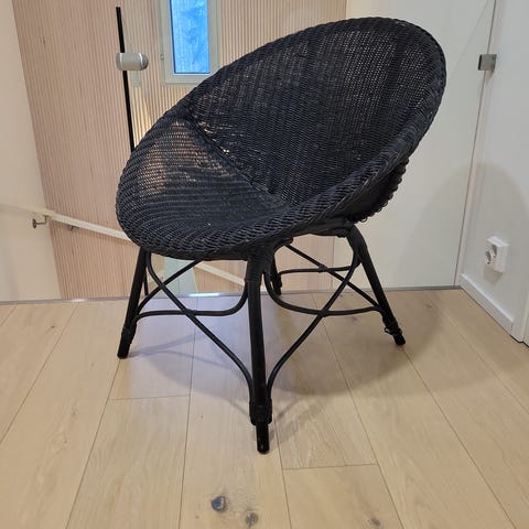Musta rottinkituoli pyörillä. Ollut työpöydän tuolina. Mahdollisuus säätää korkeutta. Ei muovirottinkia. On oikein mukava tuoli istua!