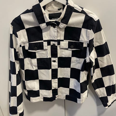 Marimekon erittäin siistikuntoinen kuviollinen farkkutakki. Design Mika Piiroinen. Väritys: musta pohja ja vaalean harmaa pallokuviointi. Laadukasta ja pehmeää puuvillakangasta. Nepparit edessä, kaksi sivutaskua ja kaksi taskua myös takin sisäpuolella. Mitat: kai-kai 53 cm ja olka-helma 63 cm.