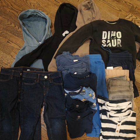 Pojalle kattava vaatepaketti, yli 2 kestokassillista. Vaatteet ehjiä ja siistejä, osa enemmän käytetty, osa kuin uusia ja jotku ihan käyttämättömiä.
