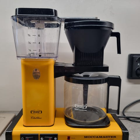 Hyväkuntoinen ja siisti, vähälle käytölle jäänyt Moccamaster. Laitteessa on manuaalinen tippalukko, ja automaattinen sammutus n. 30min kuluttua päälle laittamisesta. Teho 1350-1520W.