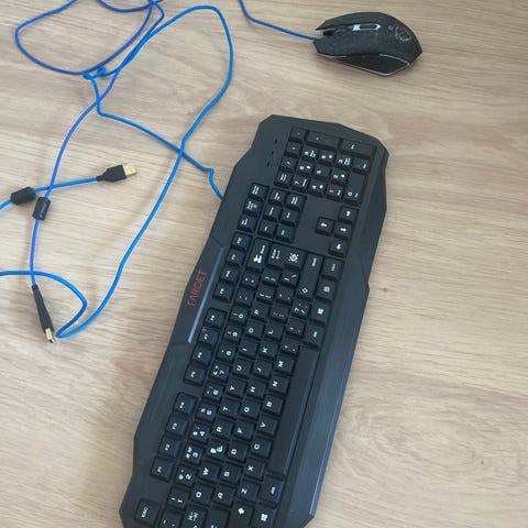 Led näppäimistö ja hiiri sekä hiirimatto.