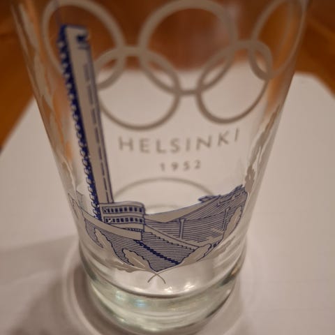 Olympialaiset Helsinki 1952 -juomalasi kirkasta lasia. Lasissa on valko-sinisävyinen painatus, jossa on olympiarenkaat, teksti "Helsinki 1952" sekä stadionaiheinen kuva ja lehtikuvioita. Korkeus 12cm. Leveys 6,7cm.