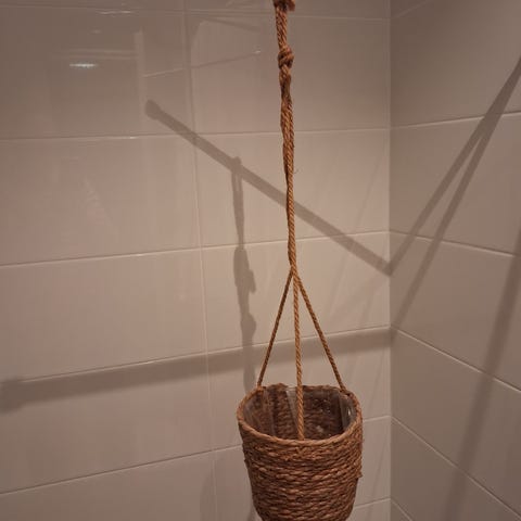 Boheemi amppeli kasveille. Ei rikki, mutta hieman tummentuneet tupsut. Korkeus n. 135 cm, amppelin halkaisija n. 24 cm