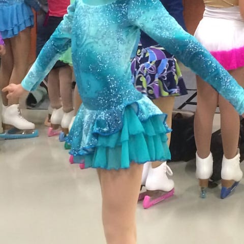 Mondorin kaunis kisamekko (taitoluistelu) ja yhteensopiva hiusdonitsi, koko 12-14 v. (142-158 cm).