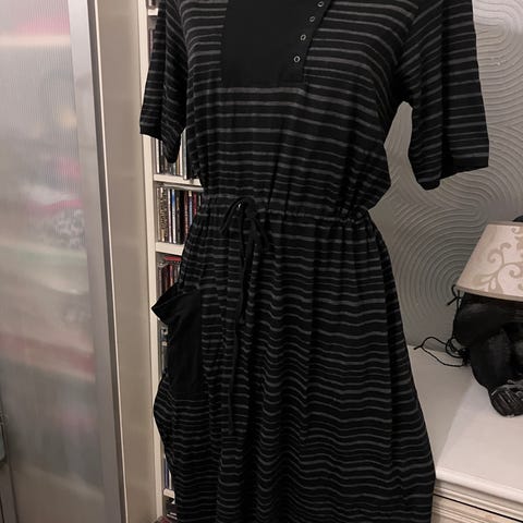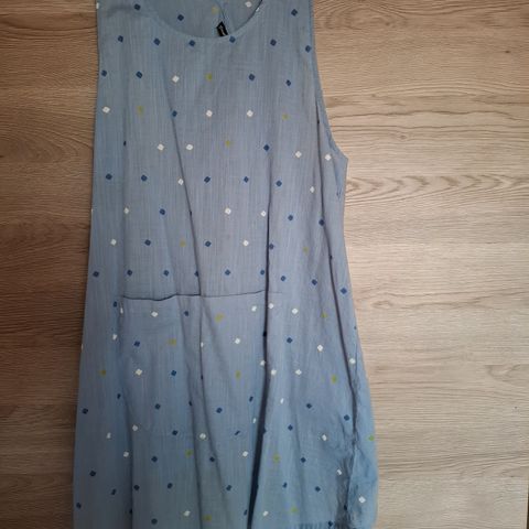 Gudrun Sjödén tunika, koko M. Mekko on sinisävyinen ja siinä on monivärinen lehtikuviointi. Materiaali on lyocellia, joka on laskeutuvaa ja pehmeää. Mallissa on V-pääntie, väljähkö leikkaus ja hihat n. 20 cm, eli jää kyynärvarren yläpuolelle. arkipukeutumiseen ja kerrospukeutumiseen. Tämä haalistui pesussa nopeasti, ja tuli pesunukkaa - vaikkei paljon käytetty olekkaan. Arkimekoksi, esim. etätyöpäivien iloksi sopii vielä. Kangas joustaa. Pituus n. 95 ja kai-kai 47.