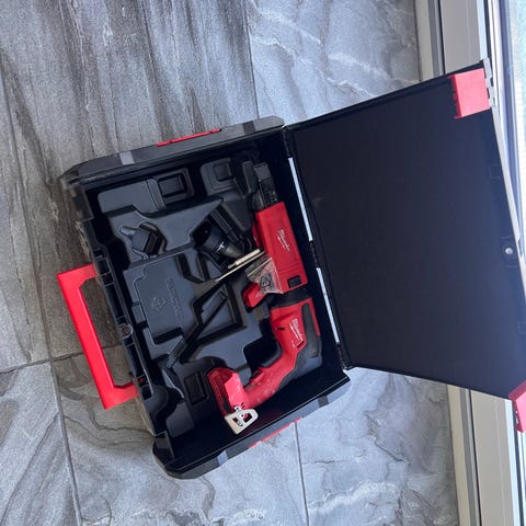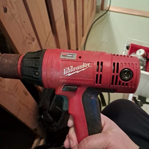 Milwaukee V18 akkuporakone ja Milwaukee V1828C -laturi. Laturin tyyppi V1828C, tulo 220–240 V ~ 50–60 Hz, 1,4 A, lähtö 18–28 V, 3,5 A. Porakoneessa karabiinihaka kiinnitystä varten. Porakone ja laturi toimii, akun kunto heikko.