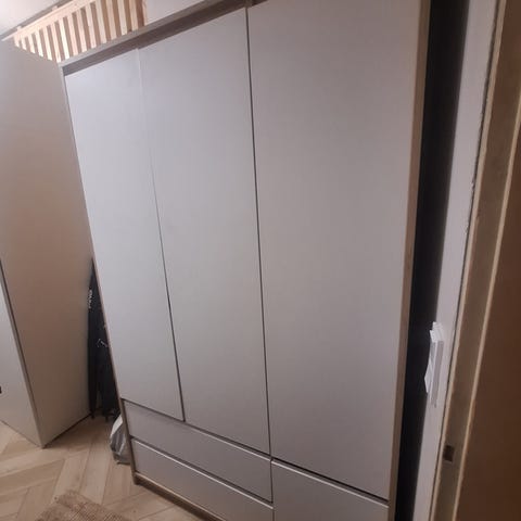 Valkoinen. N. 160cm leveä. Hyllyjä ja tanko. Voidaan purkaa.