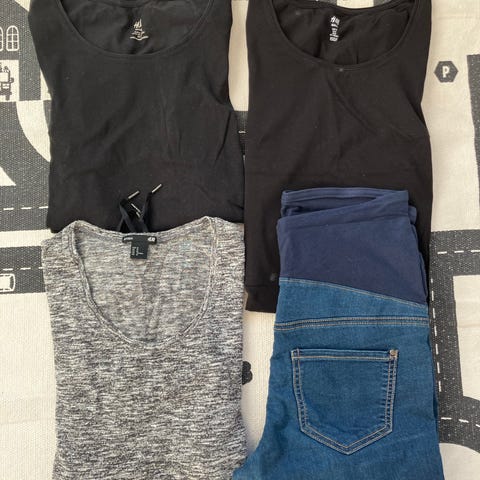 Kuvien mukaiset vaatteet lasta odottavalle ja syntymän jälkeiseen aikaan. Osa muutaman kerran käytettyjä eli kunto kuin uusi ja osa kohtalaisessa kunnossa eli kierrätettyjä. Joku huonokuntoinenkin voi olla. Olen M-kokoa ja osa vaatteista on tätä isompia huomioiden loppuraskauden ajan. Osa leikkaukseltaan sellaisia, joilla voi alkuun peittää kasvavan mahan. Kaupan päälle käyttökelpoinen hyppykiikku, jossa käsien kohdalta aukkoja purettu isommiksi.