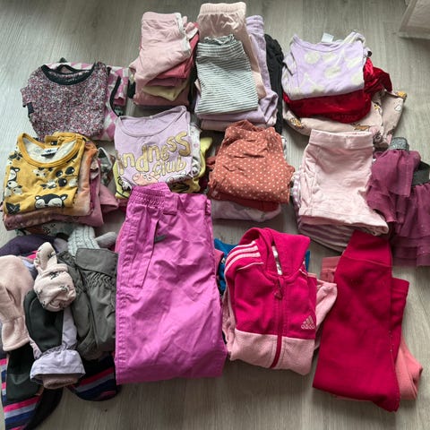 Laatikollinen tyttöjen vaatteita, kaikki kokoa 98/104. Suurin osa vaatteista ollut päiväkotikäytössä joten käytön jälkeä on.