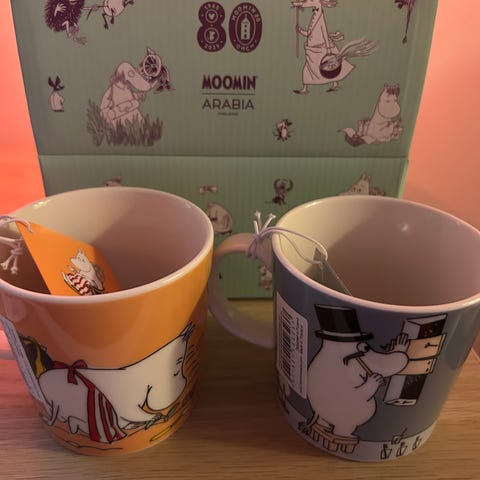 Ostan kaikki 6 mukia, joissa 80 leima pohjassa. Nämä kuusi mukia ovat: Muumimamma marmeladi, Muumipappa harmaa, Muumipeikko nurmenvihreä, Niiskuneiti lila, Nuuskamuikkunen vihreä ja Pikku Myy niityllä. Jokaisen mukin pohjassa on juhlavuoden erikoisleima