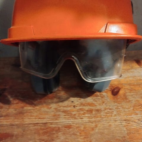 Suojakypärä , visiirillisillä suojalaseilla ja kuulosuojaimilla.
