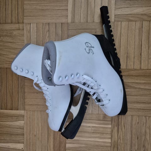 Naisten valkoiset luistimet, koko 40. Perinteinen nauhakiinnitys ja korkea varsi, joka tukee nilkkaa. Terä on tarkoitettu muuhun luisteluun, kuten harraste- tai ulkoluisteluun. Pinta näyttää olevan nahkaa tai nahkajäljitelmää. Soveltuvat aikuiselle tai nuorelle, jonka kengännumero on 40.