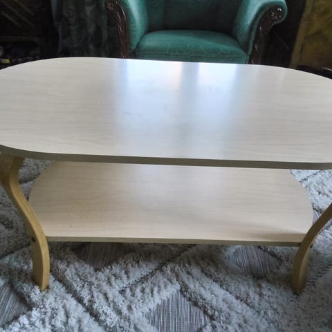 Vekestä ostettu valkoinen sohvapöytä. Hyvässä kunnossa, muutama elämisen jälki näkyy pöydässä. Haku Pirkkala.