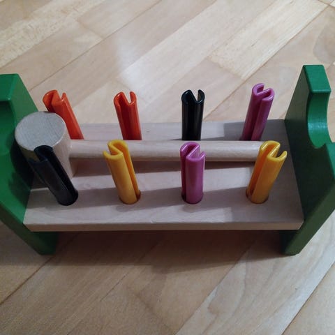 Myydään hyväkuntoinen, puinen Hakka-lelu. Vasaran jälkiä näkyy mutta toimii kuten kuuluukin ja kaikki osat ovat tallessa.