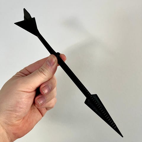 Tuote on itse mallinnettu ja 3D-tulostettu mustasta PETG-muovista. PETG kestää kosteutta, UV-säteilyä ja lämpötilavaihteluita paremmin kuin perus-PLA. Jokainen kappale kootaan ja viimeistellään käsin. Nuoleen lisätään heijasteteipit näkyvyyden parantamiseksi.