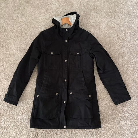 Naisten Fjällräven Greenland Winter Parka koossa XS. Takki on ollut käytössä useamman talven, joten viininpunainen väri on jonkin verran haalistunut. Takki on kuitenkin ehjä.