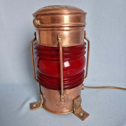 Upea laivavalaisin, valmistettu raudasta ja jossa on kauniita pronssikorostuksia.Tunnettu saksalainen meriyhtiö J.H. Peters & Bay Saksasta.Lamppu on varustettu Fresnel-lasilla, mikä saa valon näyttämään upealta.Myös varustettu johdolla ja katkaisijalla.Valonlähde toimitetaan mukana.Paljon kuvia lisätty, jotta lampun kunto voidaan arvioida hyvin.Samalla kuva, jossa lamppu palaa. Ja kuva viinipullosta, jotta koko voidaan määrittää hyvin.Valokuvien ottaminen on osa kuvausta.Lamppu lähetetään erittäin huolellisesti pakattuna, rekisteröitynä ja vakuutettuna, seurantanumerolla.Katso myös muita eräni ja säästä mahdollisesti toimituskuluissa.Ei toimiteta Yhdysvaltoihin.