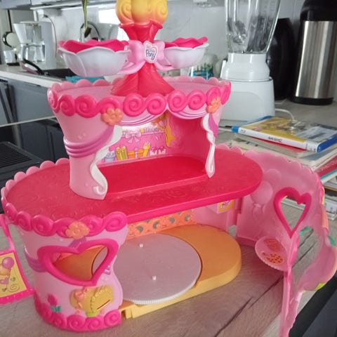 My Little Pony leikkisetti ja tarvikkeet. Settiin kuuluu muovinen leikkitalo tai -linna usealla tasolla, erillinen katososa sekä aitapaloja. Mukana on myös erilaisia pieniä muovisia leikkiosia ja tarvikkeita, jotka sopivat My Little Pony -hahmojen kanssa leikkimiseen. Soveltuu mielikuvitusleikkeihin ja poni-aiheiseen roolileikkiin lapsille, jotka käyttävät My Little Pony -figuureja tai vastaavia pieniä leluja.