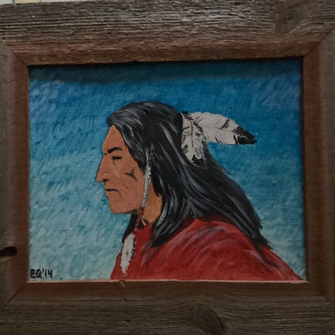 EQ Halminen 2014 -maalaus, jossa on kelopuukehykset. Teos on signeerattu alareunasta merkinnällä "EQ -14". Maalauksessa on esitetty perinteiseen päähineeseen ja asuun pukeutunut intiaanipäällikkö. Tausta on lämminsävyinen ja kehykset ovat rouheat, luonnonpuun sävyiset. Sopii seinälle tauluksi esimerkiksi olohuoneeseen, työhuoneeseen tai mökille.
