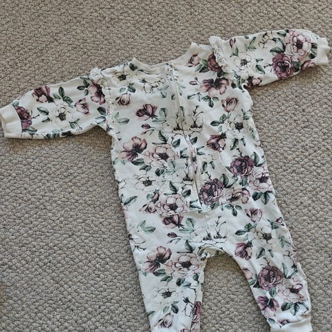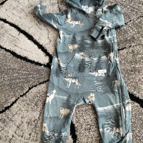 Newbie jumpsuit / haalari, koko 80. Vetoketjut ja nepparit. Toisessa polvessa paikattu pieni reikä (ks. kuva).