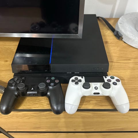 Sony Playstation 4 -pelikonsoli sekä kaksi mustaa DualShock 4 -ohjainta. Toinen ohjaimista kokenut enemmän (kuten kuvista näkyy), mutta kumpikin toimii!