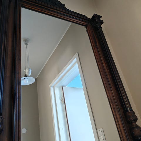 Tyyli: Ornamentaalinen muotoilu voluutteineen, kukka-aiheineen ja kaiverrettu harja viittaavat rokokoo- tai Louis XV -tyyliin, joka on yleistynyt vintage-replikoissa.Materiaali: Veistetystä puusta.Muoto: Siinä on soikea kehys.Mitat: noin 101 cm korkeus x 65 cm leveys x 5 cm paksuus.Syvyys. Markkinoilla on peilejä, joiden mitat ovat samankokoiset.Kunto/vahingot: Hankaus yläreunan kaiverruksessa, viittaa kevyen käytön merkkiin tai pieneen vauriin kehyksen yläosan kaiverretussa osassa.Tällainen peili on suosittu koriste-esine, joka antaa minkä tahansa tilan klassisen ja elegantin ilmeen.Se lähetetään huolellisesti paketoituna ja empaikoituna.