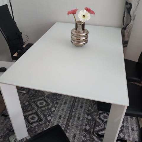 Perussiisti valkoinen keittiön pöytä. Tukeva rakenne. 10v käytössä ollut, joitakin pieniä jälkiä on. Koko 100x180cm, korkeus 76cm. Nouto ja käteismaksu.