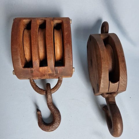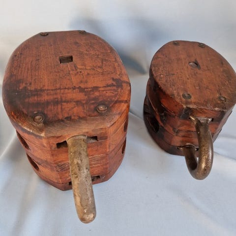Erilaisia laivatarvikkeita kisteissä. - Puu, Messinki