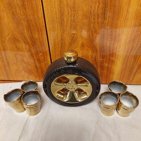 Pullo on kirkasta lasia, koristeellisilla meripihkanruskeilla yksityiskohdilla.