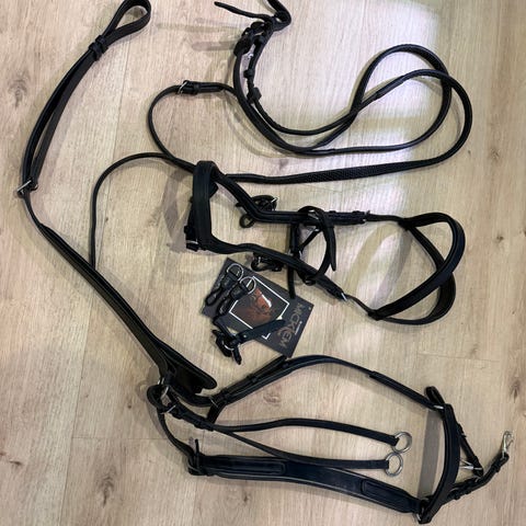 Rusket, käytetyt mutta hyväkuntoinen, mukaan uudet remmit johon saa kuolaimet. Väri hieman lähtenyt, mutta ei näy koska tulee hevosta vasten.