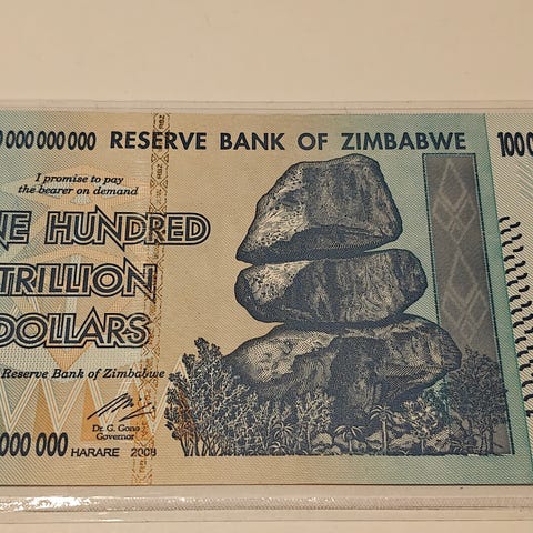 Zimbabwe 100 billion dollarin seteli. Setelin nimellisarvo on 100 000 000 000 dollaria. Seteli on käyttämätön ja kuvissa näkyvässä muovitaskussa.