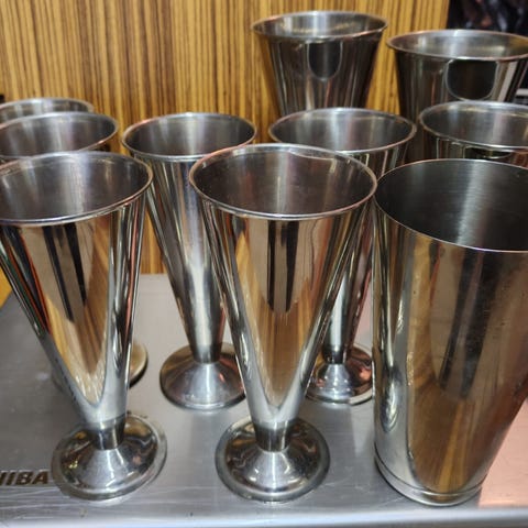 Kaksi hyväkuntoista teräsmaljakkoa. Korkeutta noin 25cm.