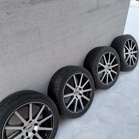 Kaupan kuvan Volkswagen Passatissa (2011) alla pyörinyt rengassarja. Vanteet laadukkaat saksalaiset RC-Design merkkiset (KBA 47108) Leveys 7" ja ET 42. Kitkarenkaat nähneet jo parhaat päivänsä, pintaa noin 4 mm. Yksi rengas tyhjentynyt säilytyksen aikana... Vanteet ovat suorat, niissä on joitain pieniä naarmuja, mutta ei kanttari-ihottumaa.