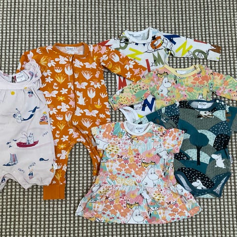 Norsubody, pinkkiraita, pupubody ja Muumi käytetympiä, muumissa haitua/kevyttä nukkaa.
