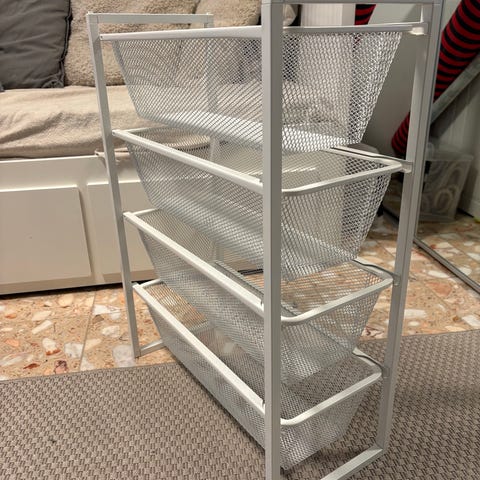 Myydään Ikean Jonaxel (?) lankakorihyllykkö, neljällä korilla. Kaksi isompaa ja kaksi pienempää. Koreissa pienet silmät eli ei tavara putoa läpi. Hieman maali kulunut toiselta puolelta päältä (kuva), mutta muutpin ehjä. On ainakin tällä hetkellä vielä koottuna. Mitat k: 100cm, l:41 cm ja s: 59,6.