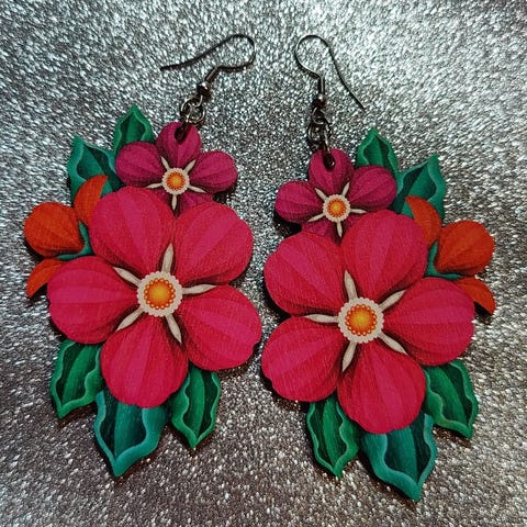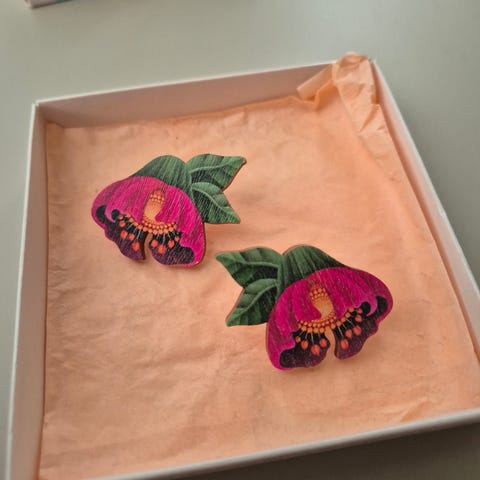 Myydään Design By Kieton jouluiset korvikset. Kotimaista koivuvaneria ja ruostumatonta terästä. Kuva molemmin puolin.