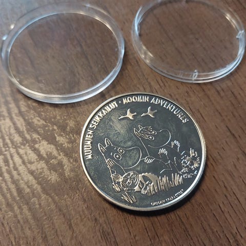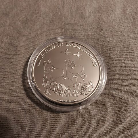 Upea Muumi-mitali taikatalvi 1957,24 karaatin kultauksella,halkaisija noin 38,6mm paino 26g