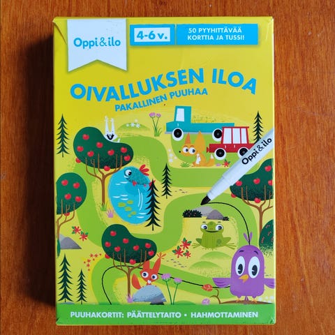 Myydään hyväkuntoinen Oppi&ilo One Two Three - Ensiaskeleet englantiin oppimiskorttipeli. Kaikki kortit jäljellä. Joissain korteissa saattaa olla tussinjälkiä. Pyyhittävää tussia ei tule mukana.
