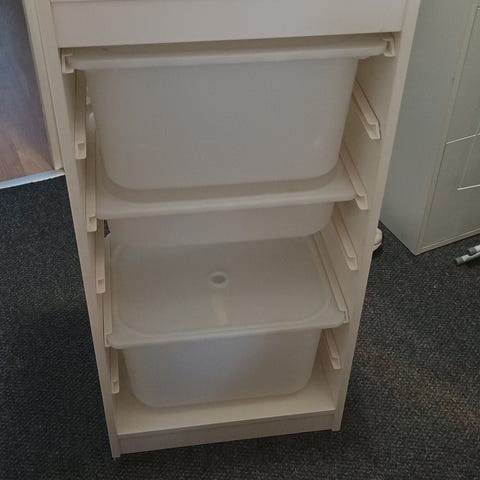 IKEA hyllykkö valkoinen värikkäillä säilytyslaatikoilla