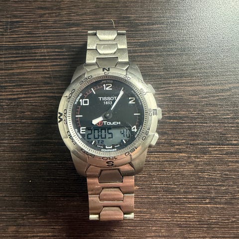 Tissot T-Touch Connect Solar miesten rannekello. Kellossa on teräksinen runko ja teräsranneke, jossa harjattuja ja kiillotettuja lenkkejä. Kellotaulu on tumma ja siinä on kosketusnäyttö, jota ympäröi kompassimerkinnöillä varustettu musta kehä. Takakannessa on merkintä T-Touch Connect Solar sekä mallinumero T121420A. Kello on suunniteltu miehille ja se toimitetaan alkuperäisessä Tissot-laatikossa ja papereiden kanssa kuvien mukaisesti.